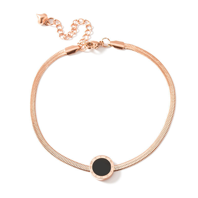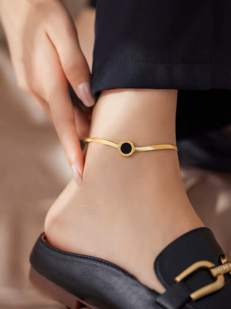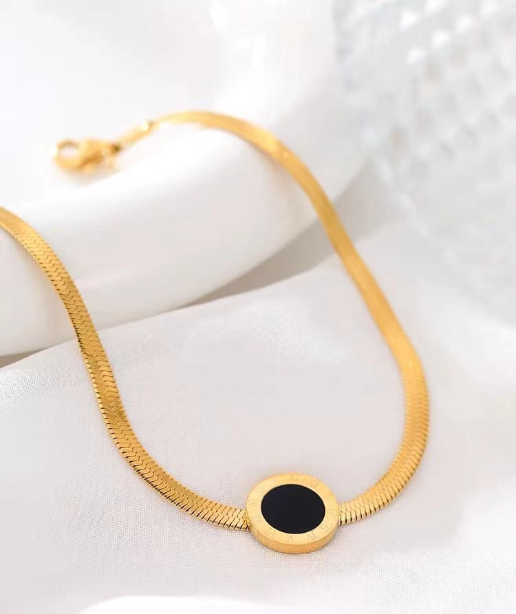 【Cf230801-6B】歐美黑圓羅馬扁蛇骨18K金鈦鋼抗敏不掉色足鍊