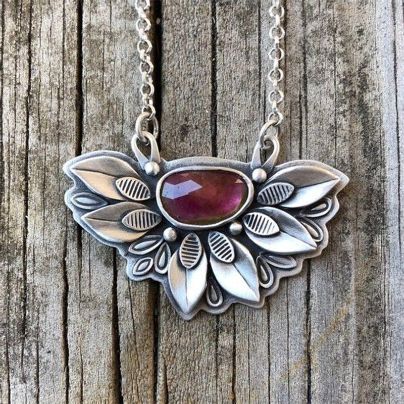 【Dn240122-6】蓮花層次感吊墜鑲紅鋯石項鍊